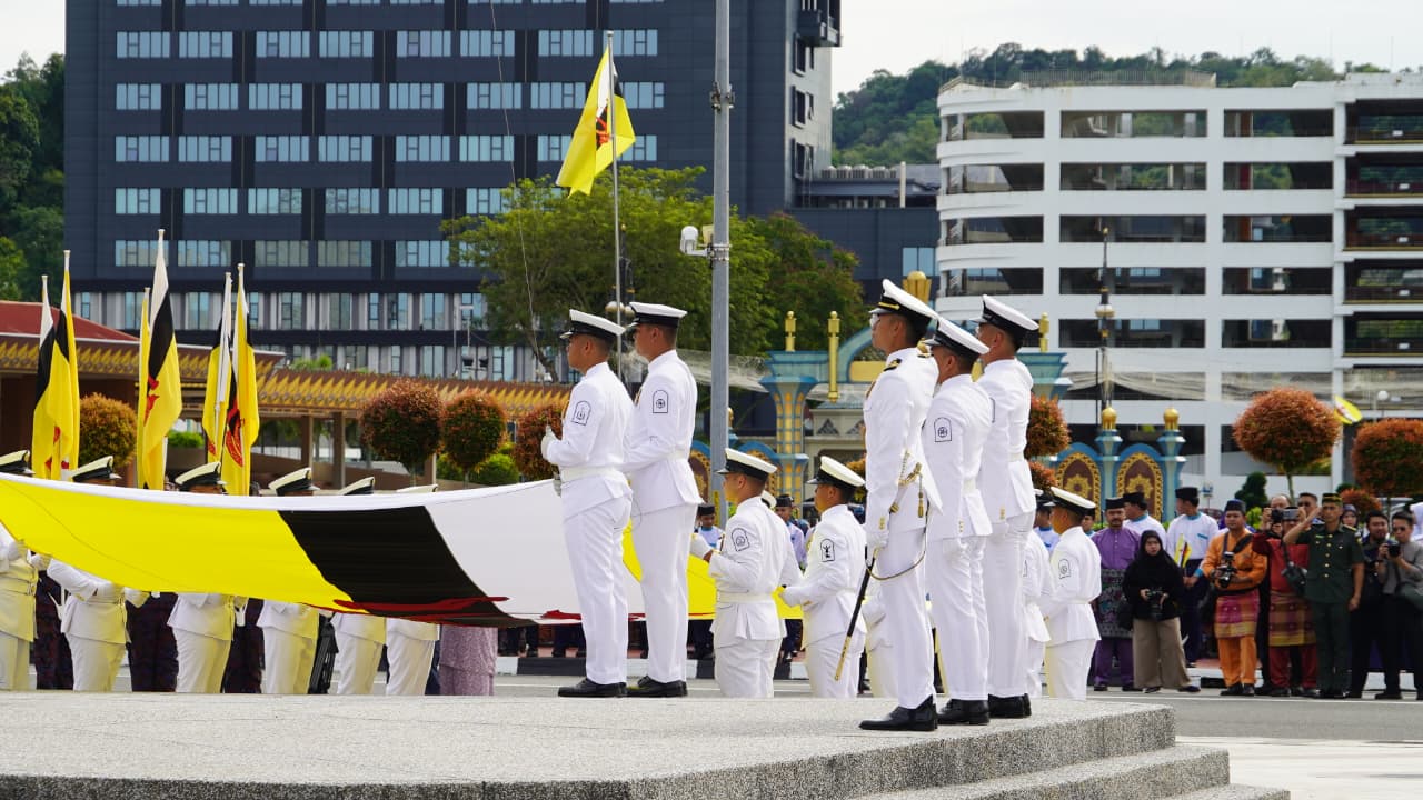 Bendera besar Negara Brunei Darussalam telah dikibarkan oleh seramai 20 orang anggota Tentera Laut Diraja Brunei yang diketuai oleh Yang Mulia Leftenan Awangku Ahmad Faiz’un Dzakiyy bin Pengiran Haji Aliuddin, TLDB, bertempat di kawasan Kompleks Yayasan Sultan Haji Hassanal Bolkiah.